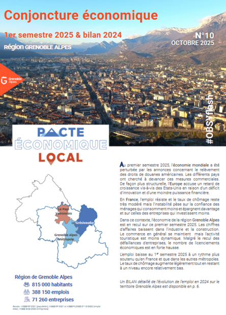 Publiée le 29 octobre 2025L’Observatoire économique Grenoble Alpes mis en place dans le cadre du Pacte Économique Local a publié fin octobre sa dixième note de conjoncture sur le bilan de l'année 2024 et le 1er semestre 2025 pour le territoire du Grand Grenoble. -